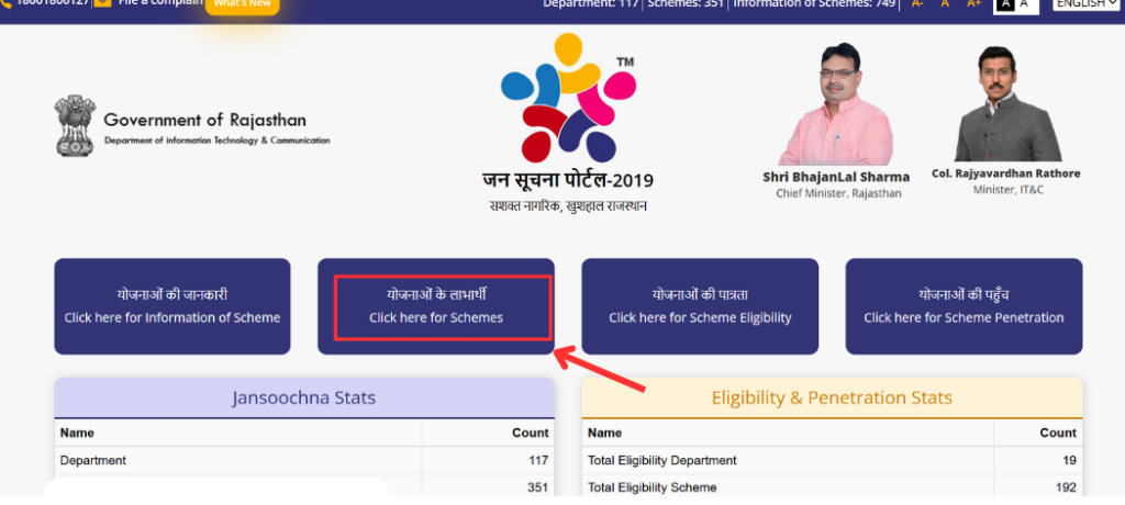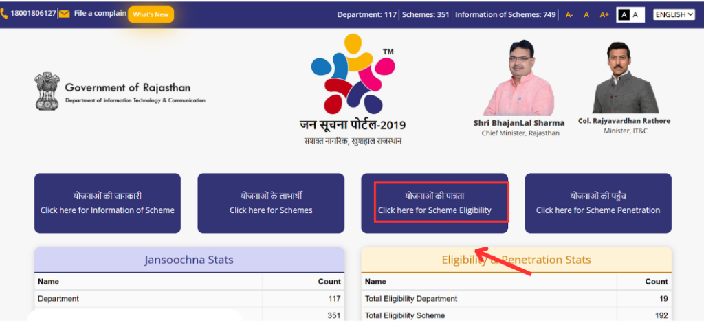 - Jan Soochna Portal परScheme Eligibility चेक करने के लिए आपको पोर्टल में योजनाओं की पात्रता बटन पर क्लिक करना है।