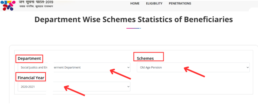 - इसके लिए आपको Jan Soochna Portal होम पेज पर दूसरे ऑप्शन योजनाओं के लाभार्थी पर क्लिक करना है।