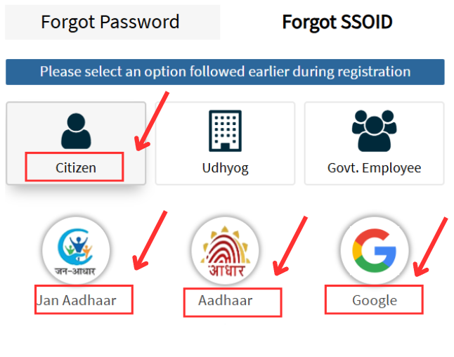 - SSO Portal Rajasthan पर SSO ID Recover करने के लिए Citizen choose करने पर आपको तीन ऑप्शन मिलते है।
